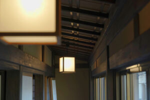 甘糟屋敷は、研修施設としての利用に際して、さまざまな改修工事が行われました。建物内部はできるだけ当時のままの姿を残すように注意深く修復されました。梁や柱などの木材は、築後の約300年もの歳月を経てもしっかりとした構造を持ち、歴史の証人としてそのまま活かされています。