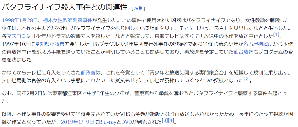 1997年に放送され、最高視聴率23.0%を記録した大ヒット作ですが、バタフライナイフ事件の影響で20年以上封印されてきました。