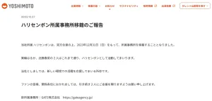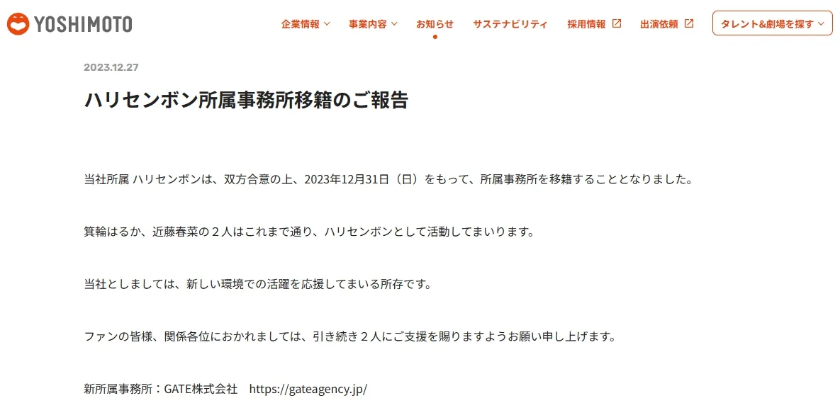 引用元 吉本興業 ハリセンボン所属事務所移籍のご報告 | お知らせ | 吉本興業株式会社 (yoshimoto.co.jp)