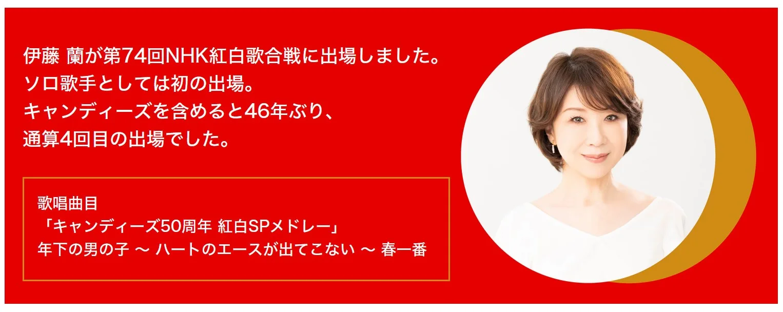 大みそかの「第74回NHK紅白歌合戦」では、伊藤蘭さんがキャンディーズ時代のヒット曲「年下の男の子」「ハートのエースが出てこない」「春一番」のメドレーを披露しました。
