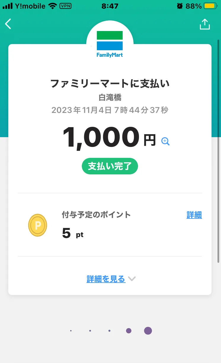 更に、ありがたい事に5pt付与されます。ちなみに、私はチャージをせず、全てポイントでPayPayを活用しています。